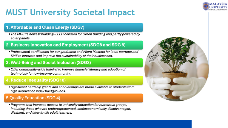 Malaysia University of Science and Technology (MUST), under the leadership of President PROFESSOR DR. PREMKUMAR RAJAGOPAL, is deeply committed to advancing the United Nations Sustainable Development Goals (SDGs) through education, research, and innovation. In line with SDG 4 (Quality Education), MUST fosters inclusive and equitable learning opportunities, ensuring that students gain the skills needed for the future. The university also prioritizes SDG 3 (Good Health and Well-being) by integrating health and wellness initiatives into academic and community programs. Emphasizing SDG 7 (Affordable and Clean Energy), MUST engages in sustainable energy research and promotes eco-friendly campus operations. To address SDG 10 (Reduced Inequalities), the university champions diversity, equity, and access to education for all. Through SDG 8 (Decent Work and Economic Growth), MUST nurtures industry-ready graduates and encourages entrepreneurship, while its focus on SDG 9 (Industry, Innovation, and Infrastructure) drives technological advancements and research collaborations that contribute to Malaysia’s socio-economic development.